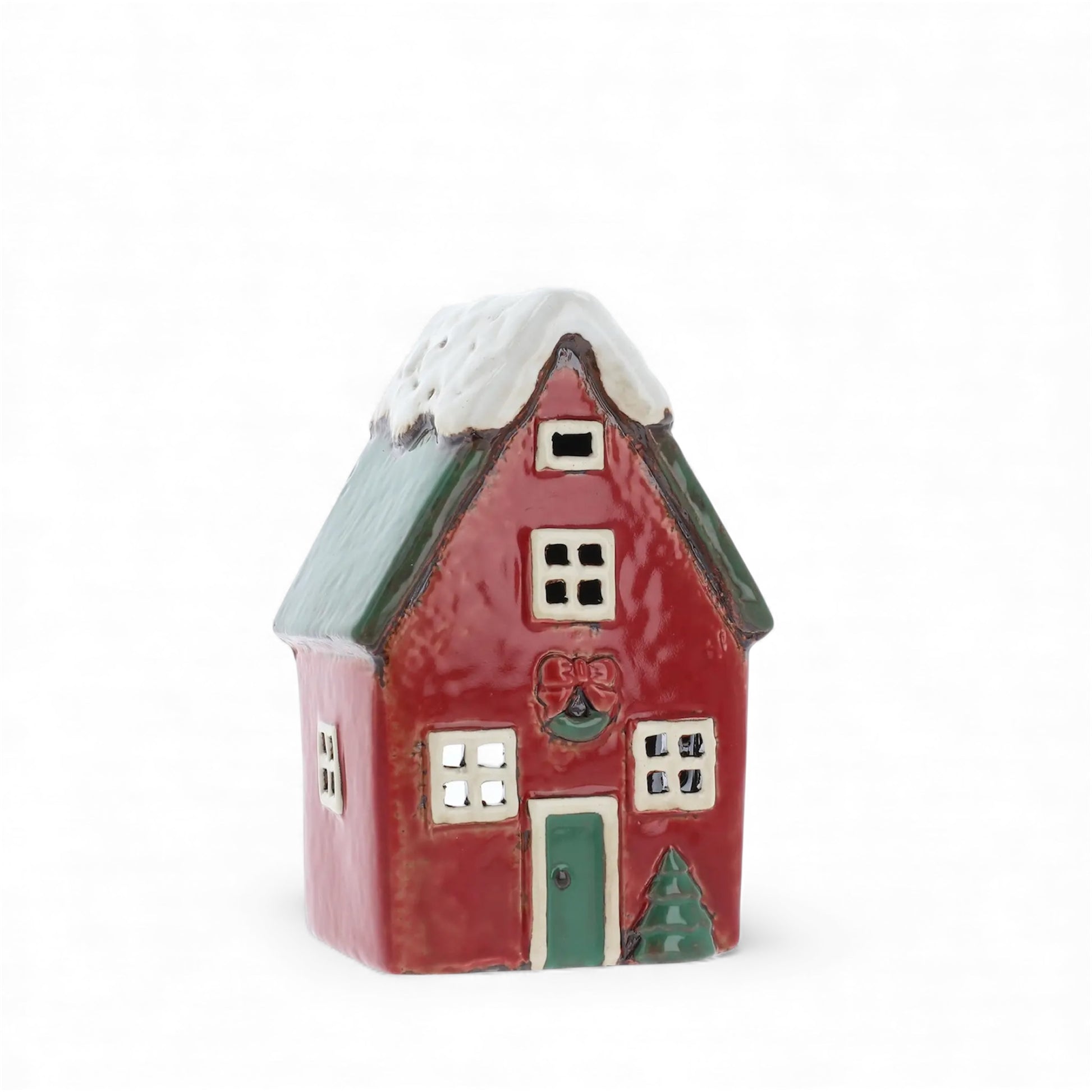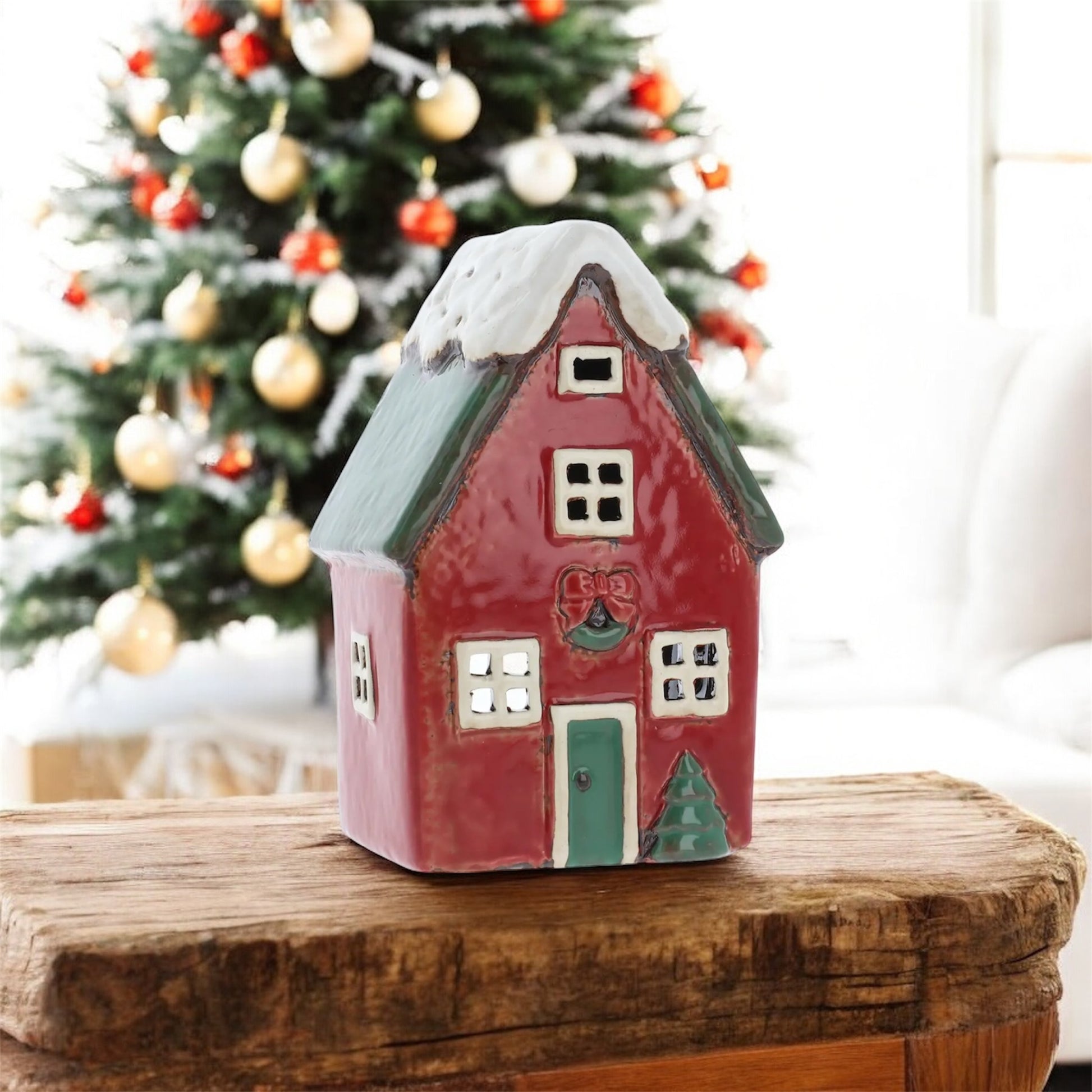 The Christmas Red House Tealight is a delightful single storey, A-framed dwelling featuring a red exterior, green door, red ribbon above the door and a snow capped roof.
