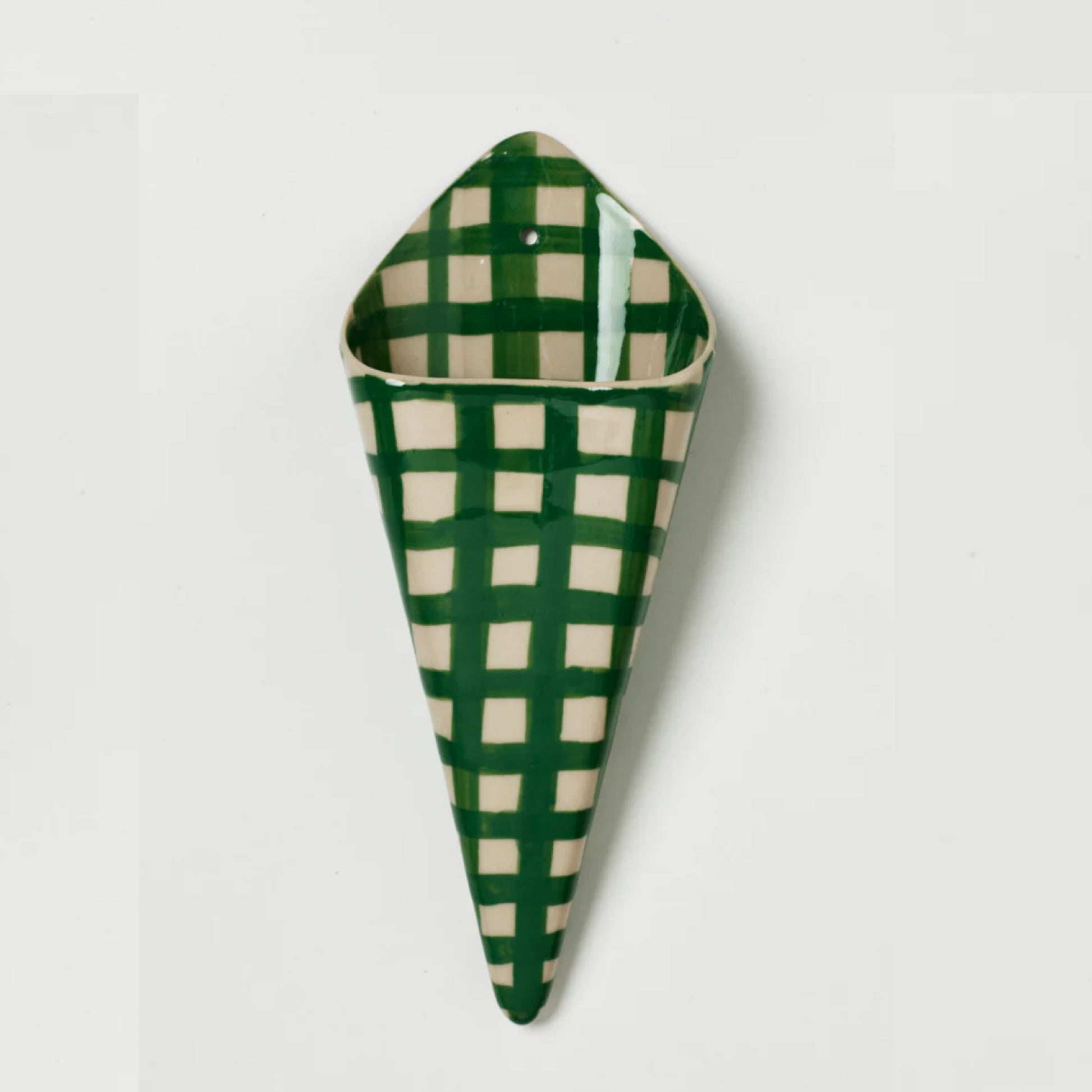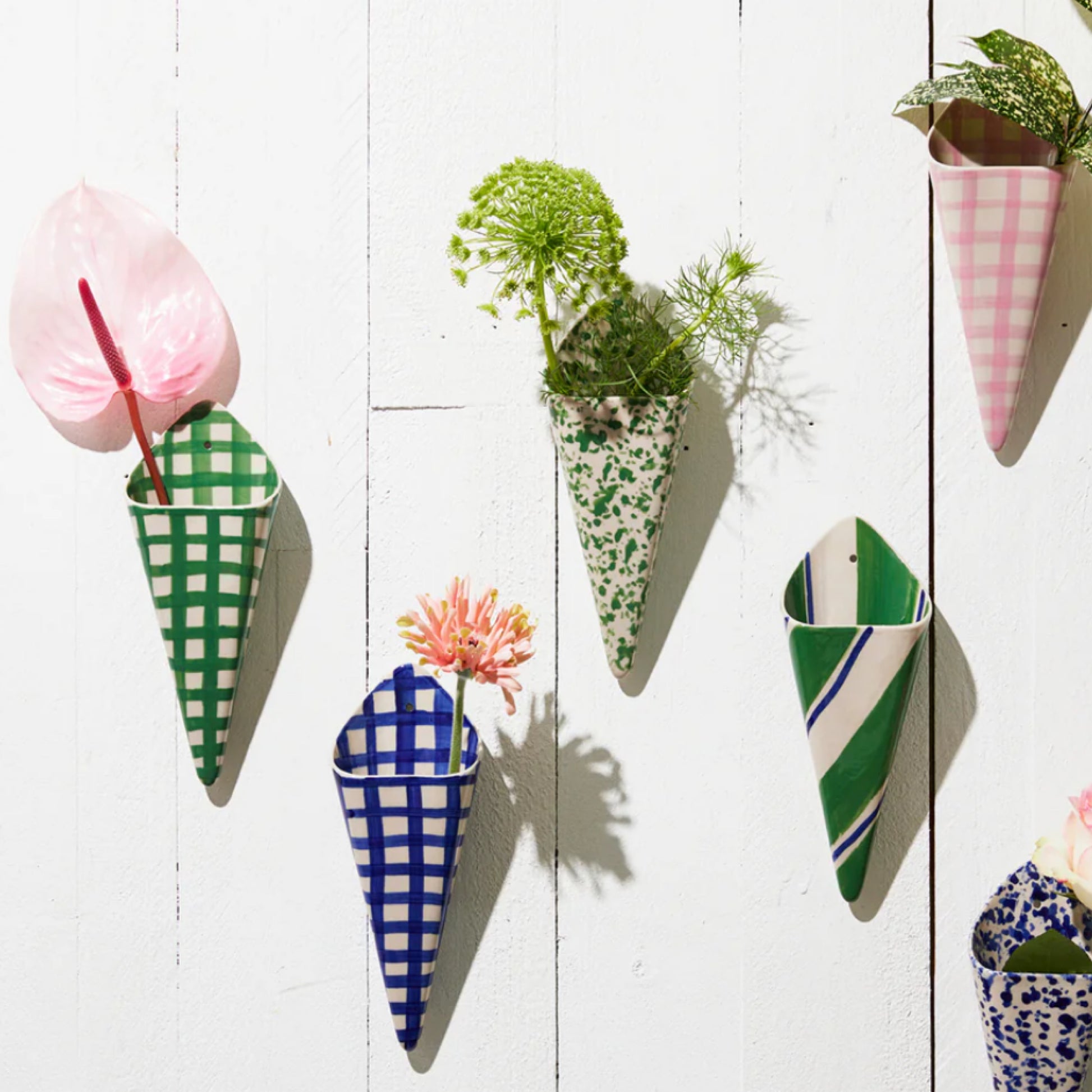 Elevate your decor with the preppy charm of the handcrafted Folly Wall Vase in Green Check from Jones & Co. This artisan made cone vase features bold green stripes accented by slim navy lines in a classic school tie design.