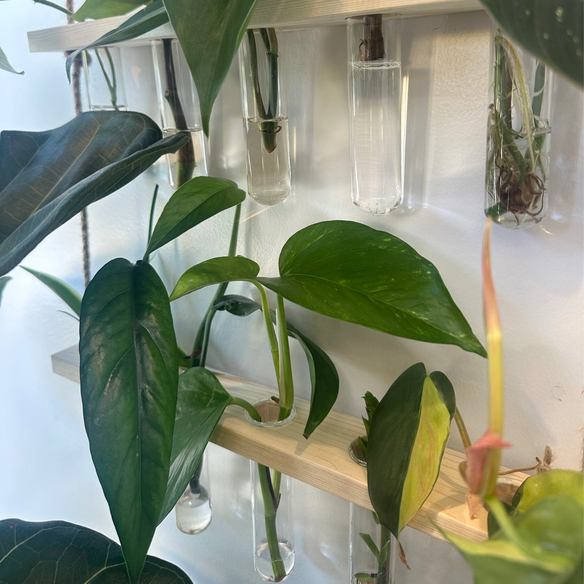 Grow you very own (indoor) vertical wall with our Hanging Propagation Station. Comprises of 15 glass test tubes over three levels. Each tube has its own established propagation stems from Philodendron cordatum, brasil and micans, Swiss Cheese, Jade, Pothos, Rhipsalis and so much more.