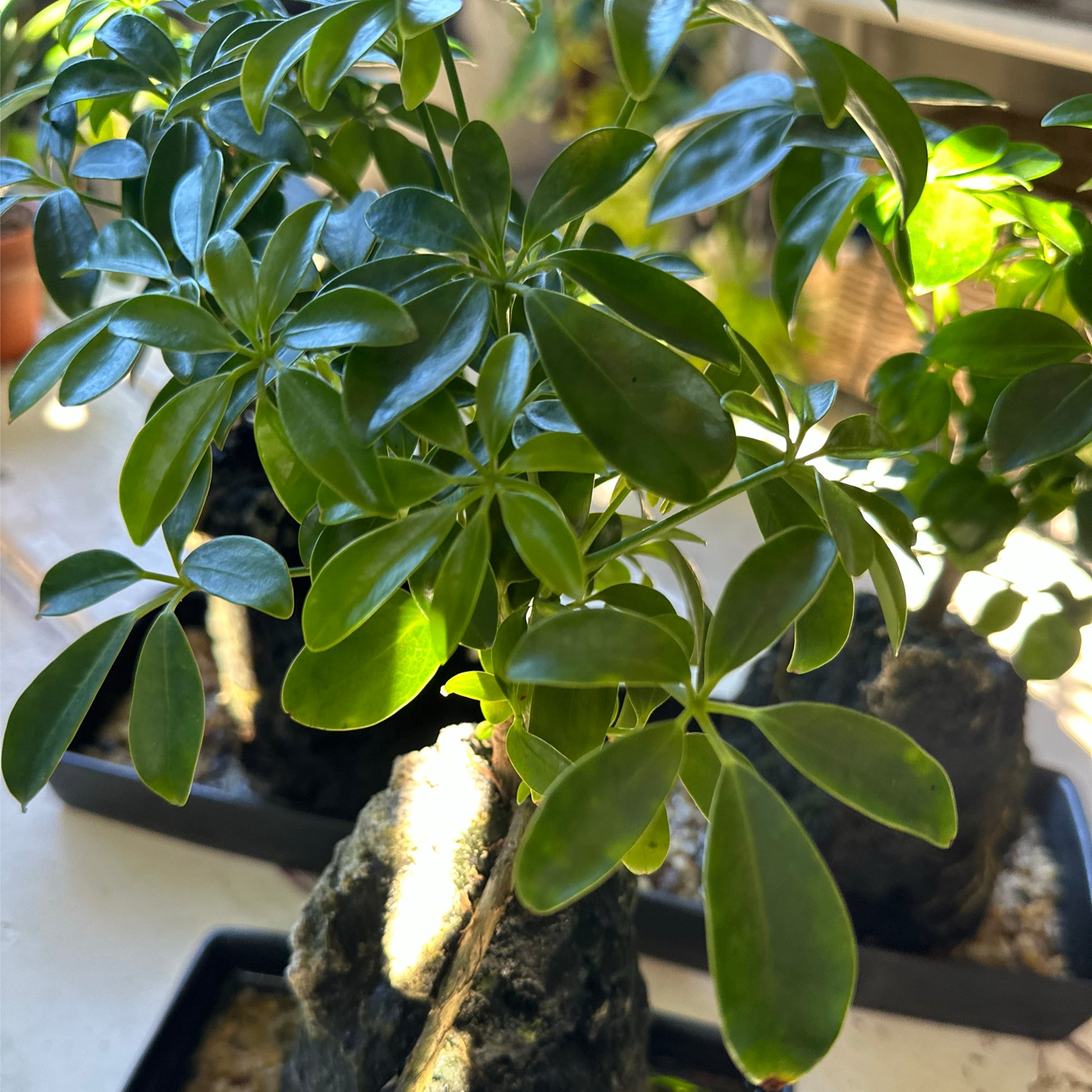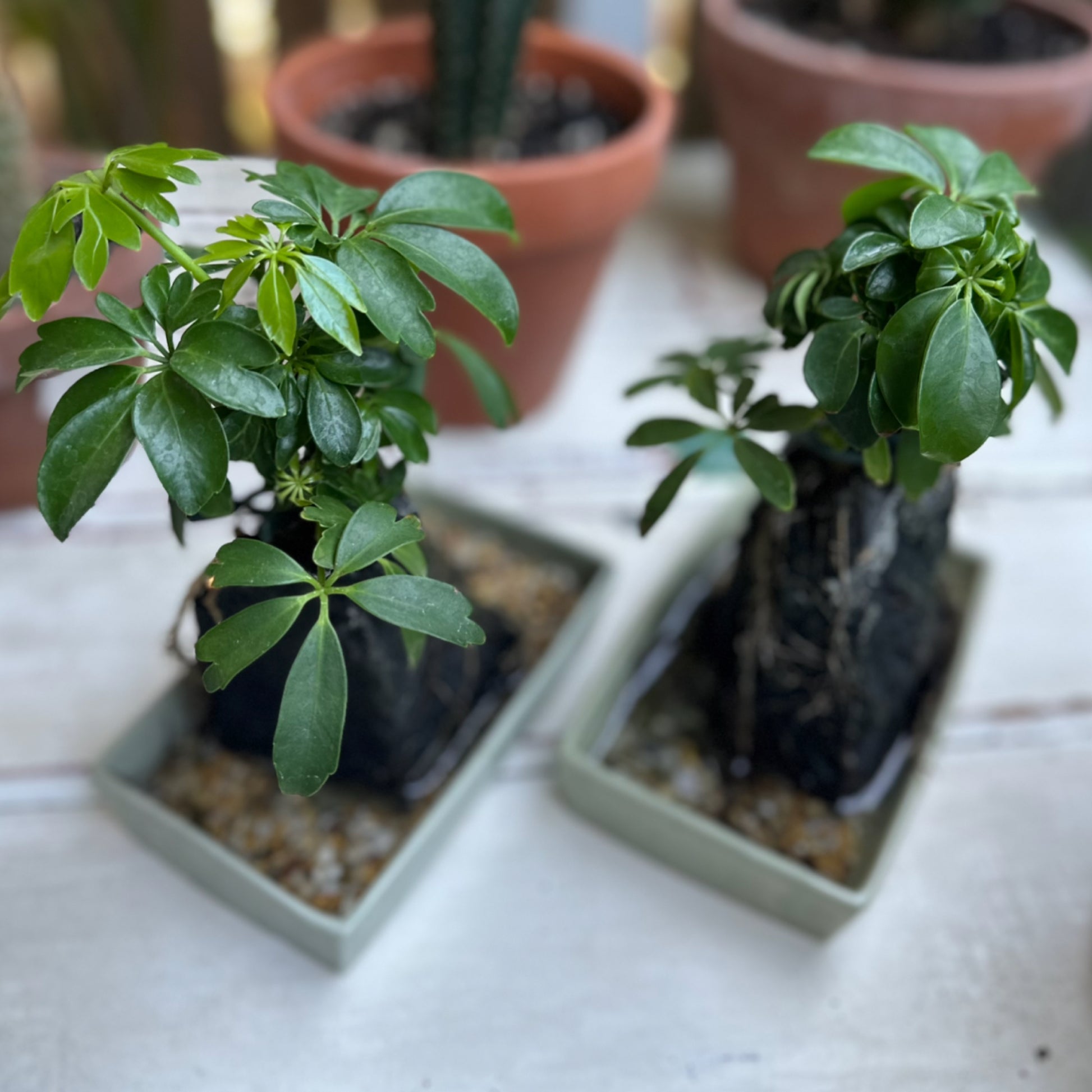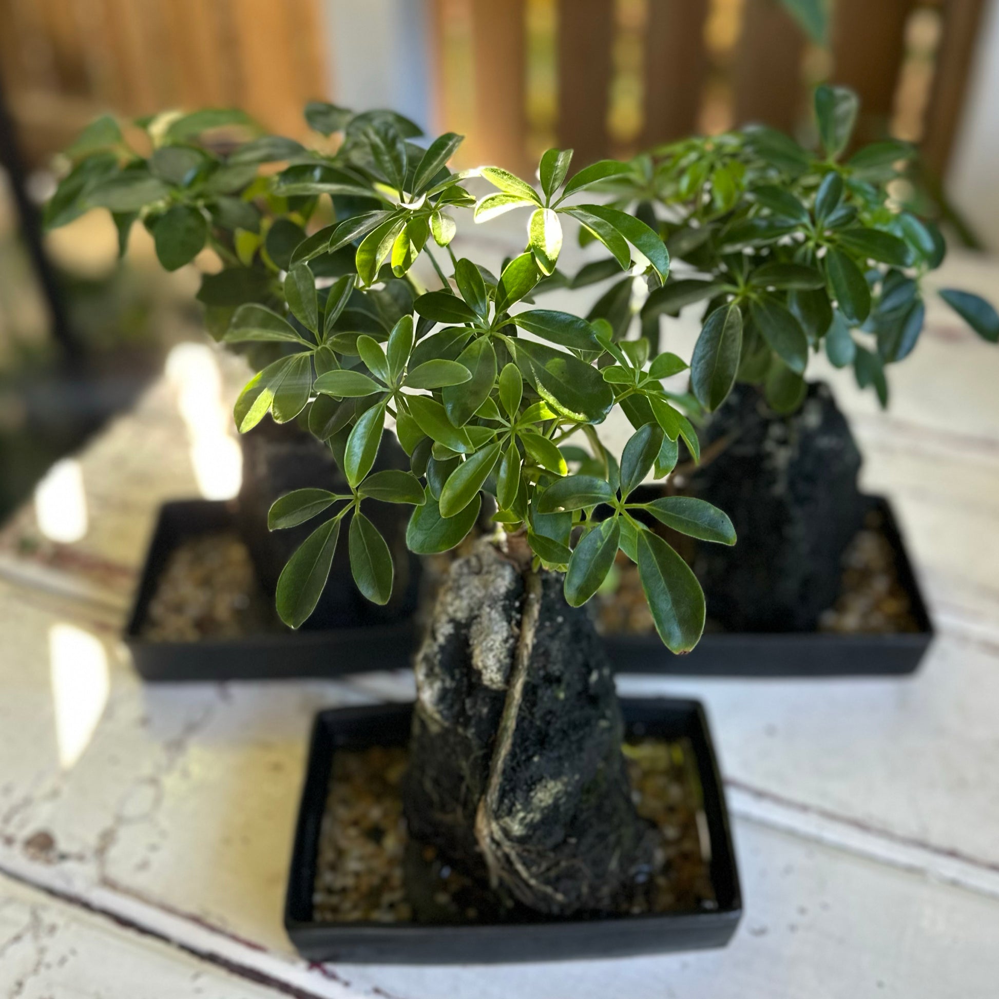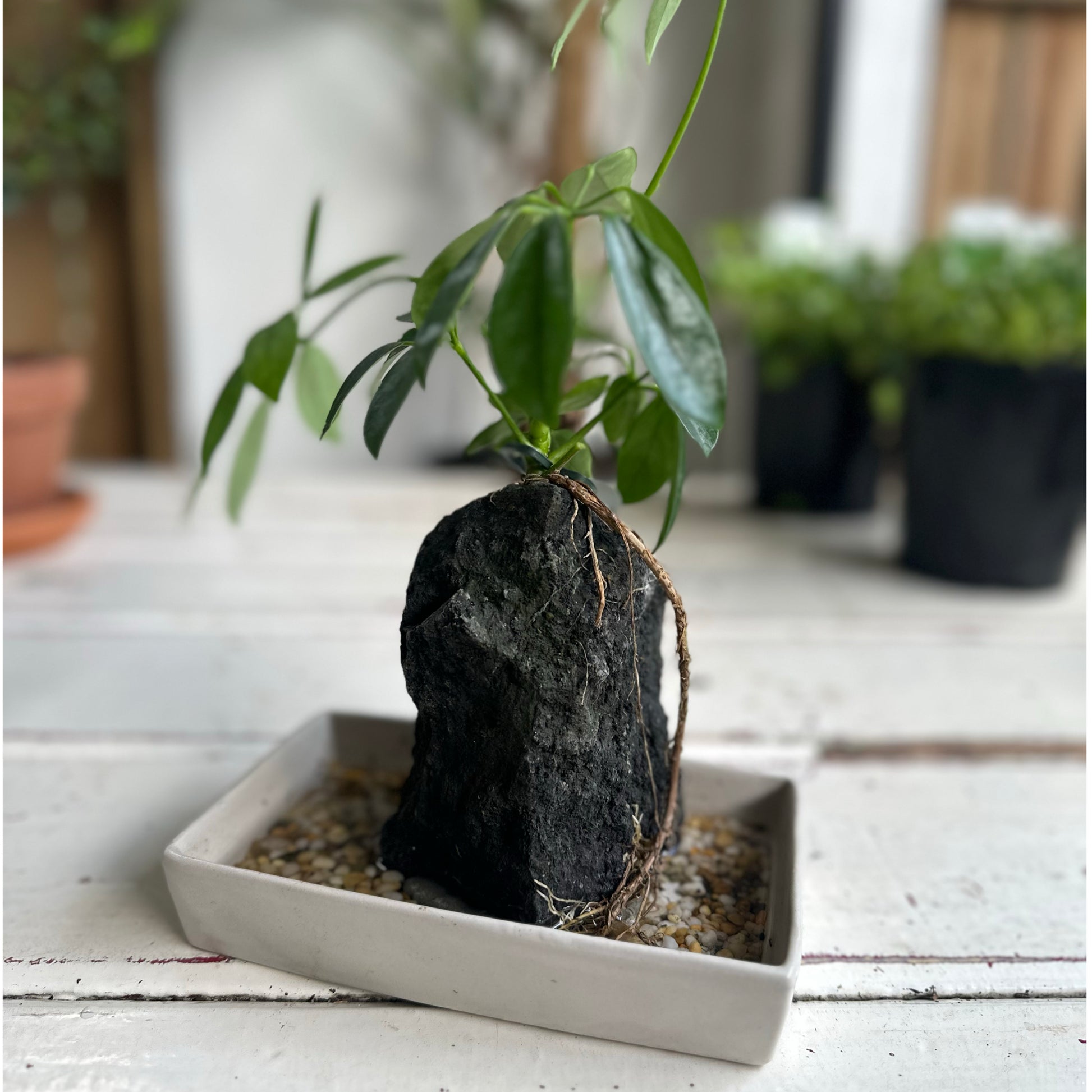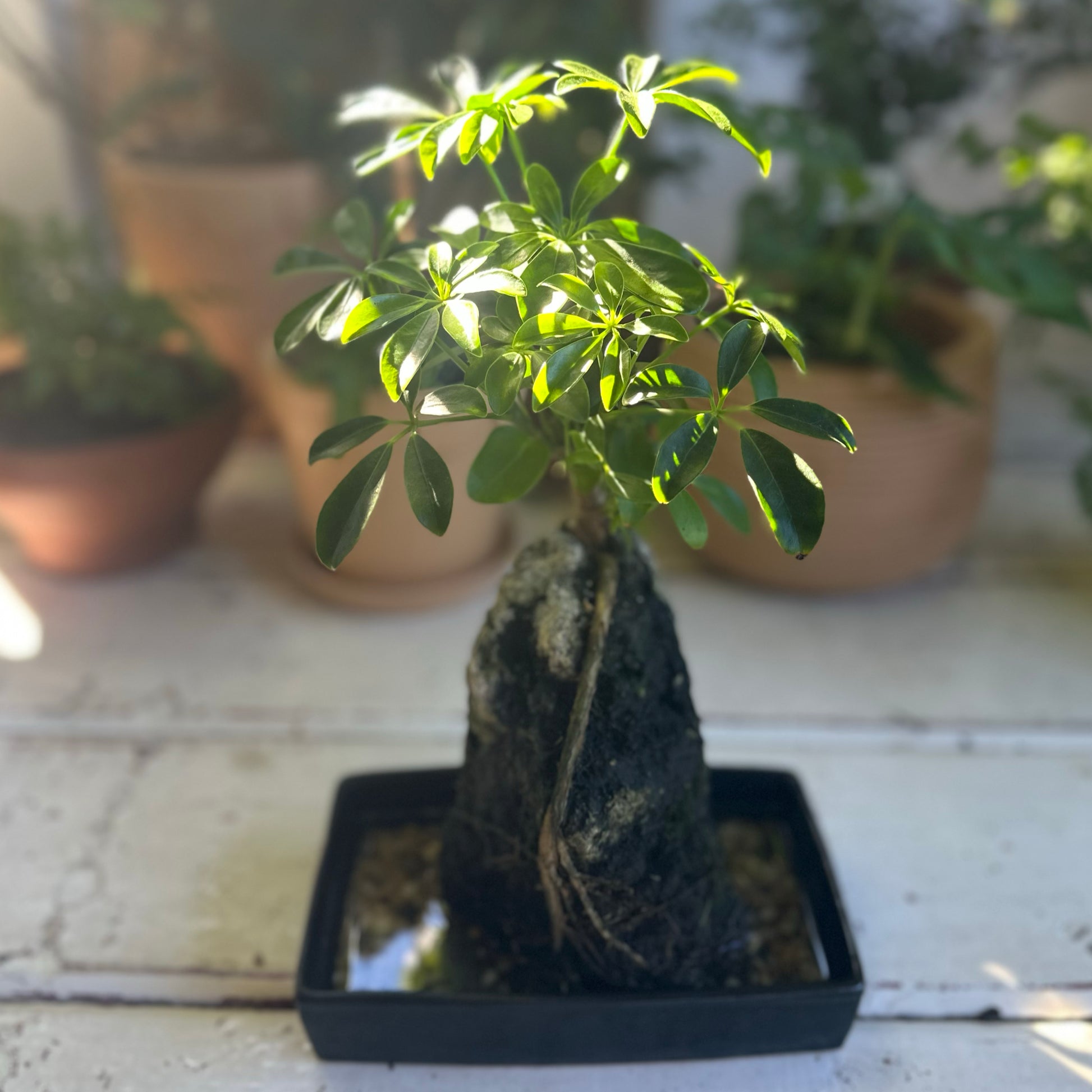 'Life on the Rocks' is a modern day bonsai (of an Umbrella Plant) but so much easier to look after. As the name suggests it's a plant living on a rock. The roots grow over the rock taking on a gnarled bonsai appearance that improves with age. There is no potting mix used and when the dish is filled with water the volcanic rock absorbs the moisture making it available to the plant roots. Moss will also grow on the rock, further adding to its bonsai appearance.