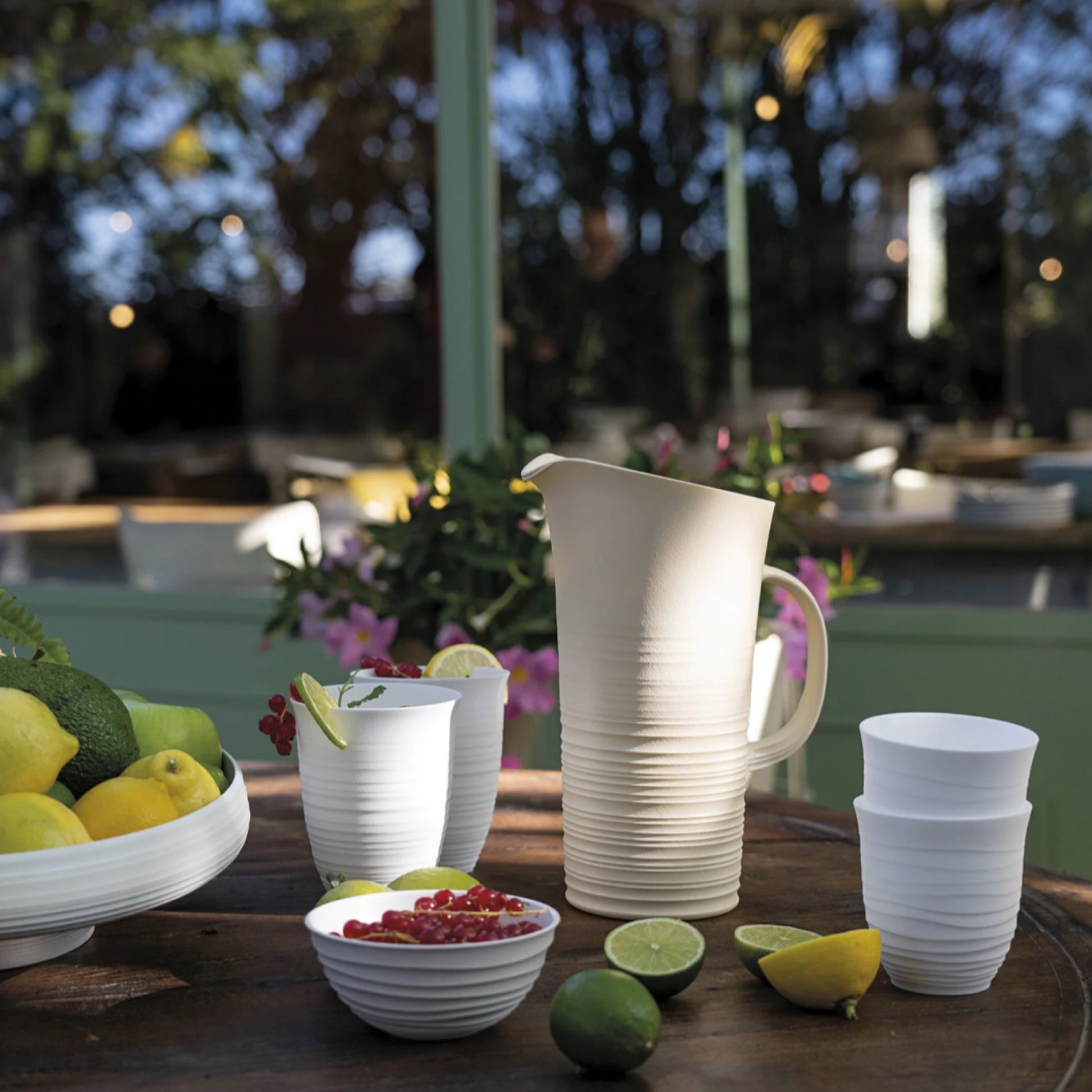 This Italian Tierra (Earth) Pitcher from Guzzini is designed for both style and practicality. Its sleek streamlined form not only enhances any table setting but also ensures ease of use, especially when outdoors. The convenient lid protects your beverages from the elements while the integral grille keeps ice-cubes, pieces of fruit or pulp in the pitcher when pouring.